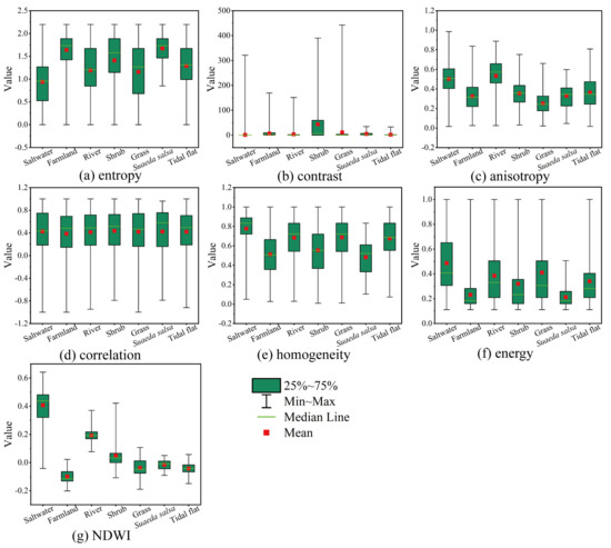 Figure 13 shows box-and-whisker diagrams for the seven most important features, which provide a preliminary insight into the causes of misclassification. It can be seen that these seven features can better distinguish the wetland landcover types. The features, such as entropy, anisotropy, homogeneity, and NDWI, contribute greatly to distinguishing different landcover due to the spectrum and appearances of wetland (Figure 13a,c,e,g). However, contrast and correlation features do not perform well due to similar wetland texture features (Figure 13b,d). The low separability of some wetland types, e.g., saltwater vs. river, farmland vs. tidal flat, and shrub vs. grass, gives rise to misclassification to a great extent.
