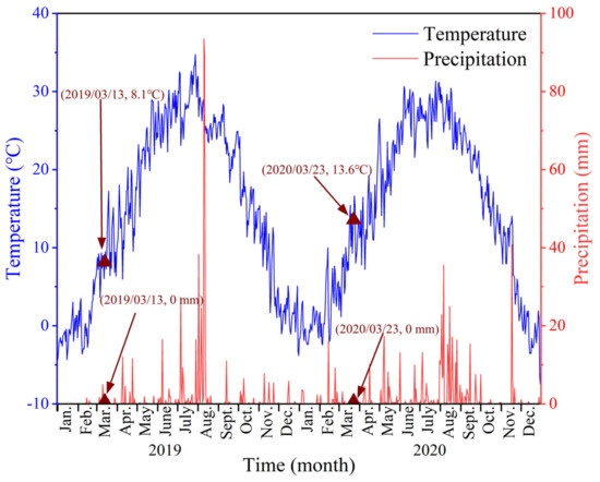 The YRD is located in the warm temperate zone with four distinct seasons and large seasonal variations in land cover [67]. The GF-3 and OHS remote sensing images in this study were collected on 13 March2019, and 23 March 2020, respectively. As shown in Figure 14, the highest temperature in March in this region was 17 °C, the lowest temperature was 2 °C, and the highest precipitation was 4 mm. Most plants were not in the vigorous growth stage, and the change rate of land cover was relatively low. In addition, the study area is located in the YRD National Nature Reserve with relatively little human disturbance. In recent years, the impact of sediment transport on the Yellow River estuary has gradually decreased [39]. Therefore, the images collected in the same month in this study can ensure the maximum reduction in the impact of wetland phenological changes.