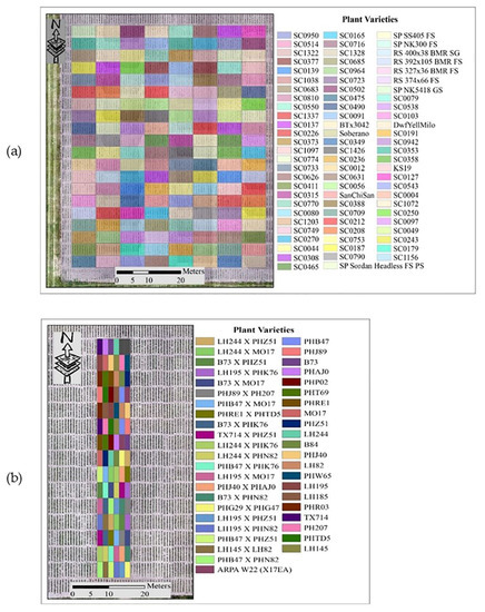 The experiments for this study were conducted at the Agronomy Center for Research and Education (ACRE) at Purdue University, West Lafayette, Indiana, USA, to evaluate the potential of sorghum varieties for biomass production and maize yield. LiDAR data utilized in this study were acquired during the 2020 growing season. The approaches to outlier removal were evaluated using LiDAR data collected from the Sorghum Biodiversity Test Cross Calibration Panel (SbDivTc_Cal) and the maize High-Intensity Phenotyping Sites (HIPS experiment). In the early stages, maize and sorghum have very similar plant structures, although sorghum is planted at a higher density (~200,000 plants/hectare) compared to maize (~75,000 plants/hectare). The geometric structure of sorghum becomes more complex as tillers develop during the season, decreasing canopy penetration. The 2020 SbDivTc_Cal experimental design included two replicates of 80 varieties in a randomized block design planted in 160 plots (plot size: 7.6 m × 3.8 m), ten rows per plot. The HIPS maize experiment contained 44 varieties of maize with two replicas, including hybrids and inbreds. This experiment had 88 plots (plot size: 1.5 m × 5.3 m), two rows per plot. Figure 1 shows the layout of the plots for the SbDivTc_Cal and HIPS experiments in 2020 based on the respective genotypes. Table 1 shows a summary of the field experiments.