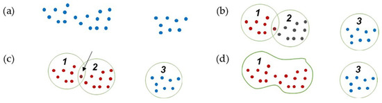 Region growing clustering steps: (a) point cloud; (b) initial clustering; (c) finding common points in two close clusters; (d) connecting and joining two clusters.