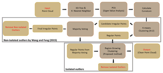 The points are structured with a k-d tree data structure, and the k-nearest neighbors to each point are determined within a defined radius. The points are assigned to the clusters based on the nearest neighbors. The clusters with common points are joined, and the cluster number is updated iteratively until no additional changes occur in the clusters. The clusters with fewer points than a specified threshold are removed as isolated outliers, and the remaining clusters are retained. In the end, the remaining points in the dataset are considered inliers. The workflow in Figure 7 shows the proposed procedure for outlier removal, with the component developed in [5] outlined.