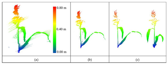 Due to the complexity and density of sorghum, the point clouds remaining after denoising did not characterize the structure of the individual plants well. The percentage of the removed points over sorghum was approximately 40% to 50% of UAV data and 30% to 35% of the PhenoRover data.