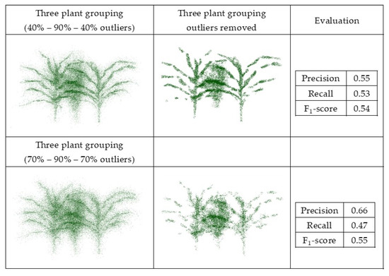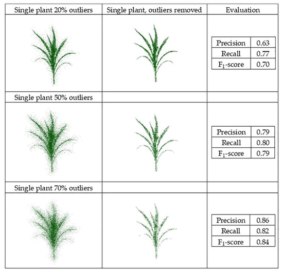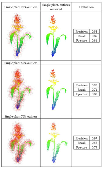 The synthetic datasets were generated from point clouds with three levels of outliers, 20%, 50%, and 70%, a radius search of one cm, and a cluster size threshold of 6. Three plant groupings with different levels of outliers, including (40%–90%–40%) and (70%–90%–70%), were evaluated using this method, as well with the radius search of two cm and a cluster size threshold of 10, which were each selected by grid search. Figure 11 and Figure 12 show the results and F1-score of each of the synthetic datasets.