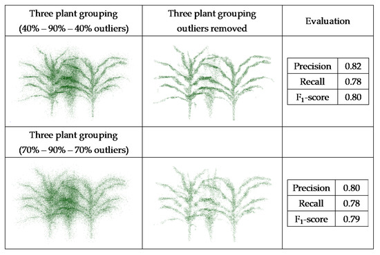 The F1-score value from the individual plant with 70% outliers (0.84) was higher than the value from the plant with 20% outliers (0.70). This is because the number of false outliers in the 20% outlier case resulted in the value of precision of the plant with 20% outliers being lower than the plant with 70% outliers. As noted for the geometric noise removal approach, the total numbers of points in both datasets were the same; the plant with 20% outliers had more inliers (80%), which resulted in more false outliers. The two sets of three plant groupings with different levels of outliers had a similar F1-score (0.79 and 0.80). The level of outliers was high in the middle plant in the grouping, and its structure was not detectable, while the structure of the plants on both sides was completely detectable as the level of outliers was lower. Comparing the deep learning results with the geometric results, it is clear that there are some missing parts of leaves in the geometric approach, while in the deep learning method, the leaves are complete and are visible.
