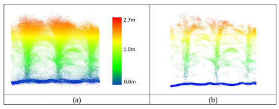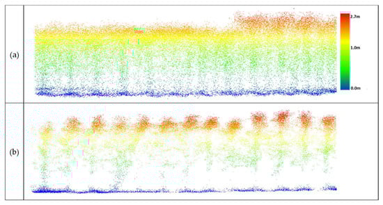 Data from UAV-2 at the altitude of 20 m over maize (DAS: 60). (a) Original point cloud perpendicular to the direction of the rows; (b) results of outlier removal using PointCleanNet.