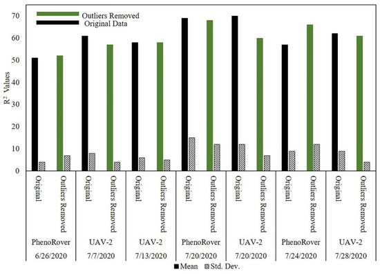 The impact of outlier removal for both the UAV-2 (VLP-32C) flown at 20 m and PhenoRover data acquired over sorghum and maize fields is illustrated in this section relative to LAI using an SVR model. The impact of outlier removal on estimates of LAI was investigated for data acquired by UAV-2 and the Phenorover data using an SVR model with an RBF kernel. The mean and standard deviation of the respective R2 values are shown in the bar chart in Figure 22.