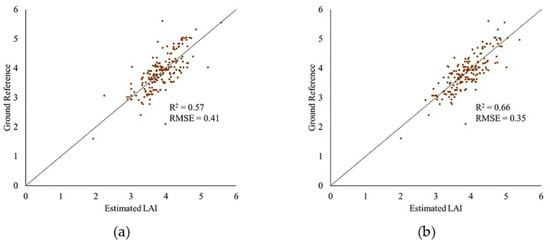Plot of estimated LAI vs. ground reference: (a) original and (b) with outliers removed from PhenoRover data (24 July 2020) using PointCleanNet method.