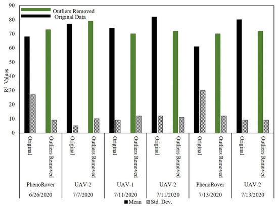 The results showed that the effect of outliers on PhenoRover data is higher than the UAV data based on the R2 value improvement after outlier removal. The R2 values resulting from denoising the UAV data decreased, but the standard deviation of R2 was also reduced. This implies that outlier removal reduced the anomalous data in terms of improving the LAI estimation, but that useful points were also removed. Overall, t-tests of the improvement related to the impact of outlier removal indicated that the change was not statistically significant at the 95% level (p-value = 0.79) based on the sample mean of R2.