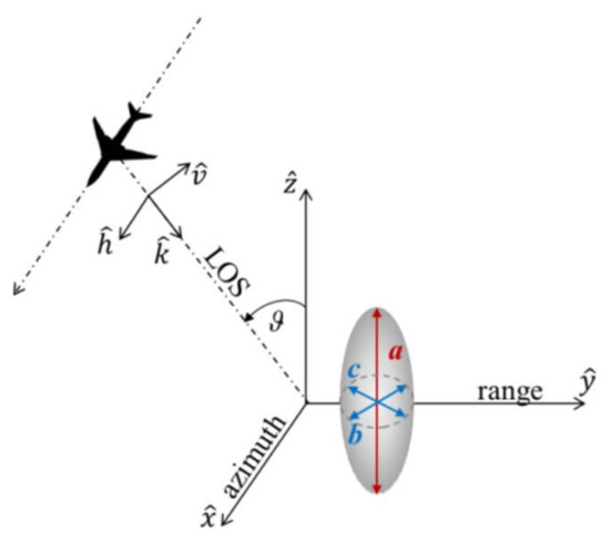 Geometry of a single spheroidal firn grain in the reference system and link to the radar reference frame , where indicates the propagation direction of the signal and ϑ is the incidence angle. The three axes a,b,c, with b = c, represent the dimensions of the grain along the and axes, respectively, and define the grain shape by the ratio . From [15].
