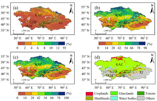 Distribution of the fractions of tree cover (a), non-tree vegetation (b), and bare cover (c). Land cover types in Central Asia (d).