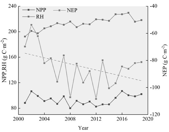 If NEP > 0, the carbon fixed by vegetation is greater than the carbon released to the atmosphere by soil respiration (i.e., a carbon sink). If NEP < 0, it is a carbon source. RH in (8) was calculated using the climate-driven model. The RH of the forest ecosystem was estimated as follows: