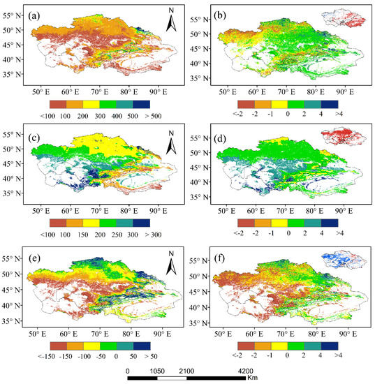 Spatial distribution of the (a) vegetation net primary productivity (NPP), (c) soil heterotrophic respiration (RH), and (e) net ecosystem productivity (NEP) in Central Asia. Multi-year trends of the (b) NPP, (d) RH, and (f) NEP; shaded areas in the inset maps to the upper right represent areas that passed the significance test (red denotes a significant increase and blue denotes a significant decrease).