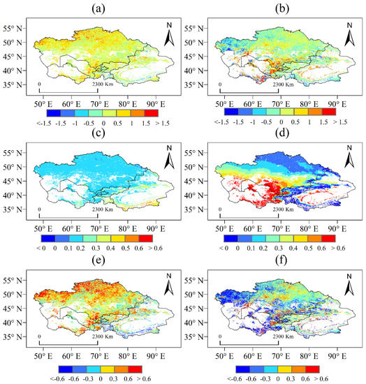 Spatially, the NPP was higher in northern and northeastern Kazakhstan, western Kyrgyzstan, and the Tianshan Mountains of Xinjiang, but lower in central and southwestern Kazakhstan, Uzbekistan, Turkmenistan, and along the edge of the Xinjiang Junggar Basin and Taklimakan Desert. High-value NPP areas were mainly covered by forest while low-value areas were covered by shrubs, herbs, and crops. The area where the NPP increased (189.35 × 104 km2) was significantly larger than the area where it decreased (32.34 × 104 km2). Among them, eastern Kazakhstan and southern Xinjiang increased significantly while western and southeastern Kazakhstan, Turkmenistan, and eastern Uzbekistan decreased significantly (Figure 3b). The RH was mainly affected by latitude and altitude. As the latitude decreased, RH tended to increase. As the altitude increased, RH decreased. As such, high soil respiration areas were mainly concentrated in the southwest. In terms of the interannual variability, 64.36% of the area increased significantly. Only the northern and central high mountain areas of Kazakhstan decreased (Figure 3d).
