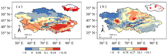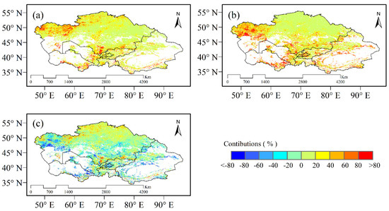 Recently, the temperature in Central Asia has increased, especially in the south, but interannual variation in the precipitation has not been significant (Figure 5). Owing to the high sensitivity of the RH to temperature, the increase in the temperature in most parts of southwest Central Asia has accelerated soil respiration and caused substantial carbon loss. Overall, the contribution rate of warming to the interannual variability of the NEP was larger than that of precipitation. The contribution rate of precipitation changes to the NEP interannual variation was approximately 23.23%. Here, 58% of regional precipitation contributed <20% to the NEP, which was concentrated in the central and northeast regions of Central Asia (Figure 6a). Further, 32.68% of the areas had a negative contribution, which were distributed in forest coverage areas of northeast Central Asia and around Kunlun Mountain, characterized by a coniferous forest coverage ratio of 9.94%. The area where the contribution rate of precipitation to the NEP was between 20% and 40% accounted for a 24.64% contribution rate. The regions with >40% contribution rate accounted for 17.01% of the region, mainly in the west and southwest. Only 1.50% of the regions contributed > 100%. In contrast, temperature showed a greater contribution to the interannual variation of the NEP. The contribution rate of the temperature change to the NEP interannual variation was approximately 28.79%. Furthermore, 56% of the regions contributed <20% of the temperature, with the largest contributions concentrated in western and southern Central Asia (Figure 6b).