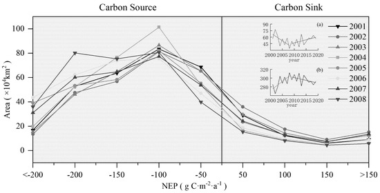 Annual net ecosystem productivity (NEP) area distribution in Central Asia from 2001 to 2008. (a) Area of the change in the carbon sink from 2001 to 2019 and (b) area of the change in the carbon source from 2001 to 2019. The red line is the slope for 2001 to 2008 and the blue line is the slope for 2009 to 2019.