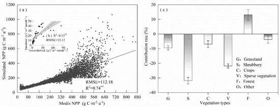 Since 1880, the average global temperature has increased by 0.85 ± 0.2 °C [1]. The burning of fossil fuels and the rapid reduction in the forest area have resulted in the emission of large quantities of carbon into the atmosphere. Therefore, climate change and increasing atmospheric carbon dioxide concentrations have attracted extensive attention [2]. The Paris Agreement stipulates that by the end of this century, the temperature rise should not exceed the pre-industrialization level by more than 2 °C [3]. To achieve this goal, we must better understand the feedback relationship between terrestrial ecosystems and the climate. The net ecosystem productivity (NEP) represents the net carbon exchange between terrestrial ecosystems and the atmosphere [4]. It is an important index for the quantitative estimation of the carbon source/sink of terrestrial ecosystems [5,6].