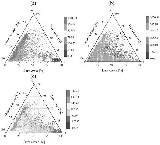 (a) Vegetation net primary productivity (NPP), (b) soil heterotrophic respiration (RH), and (c) net ecosystem productivity (NEP) as a function of the fractions of tree cover, non-tree cover, and non-vegetation pixels.