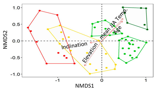 Successional stages on the glacier forelands of Fürkele-, Zufall- and Langenferner. The results of the in-situ sampling are shown as NMDS of sample plots. In the NMDS, the colored dots and polygons indicate the different successional stages: red = pioneer stage (15 plots), yellow = early successional stage (16 plots), light green = late successional stages (27 plots), dark green = dwarf shrub stage (7 plots). The vectors (red arrows) indicate the environmental variables (age, elevation, inclination, mean JJA temperature) with a significant influence on the grouping. The length of the arrows shows the correlation between the variable and the ordination.