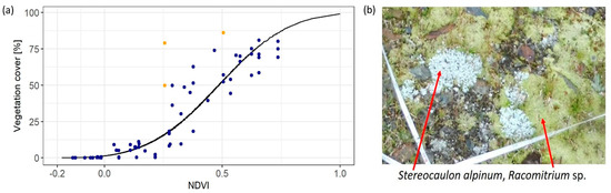 Comparison of the NDVI-based predicted vegetation cover and the in-situ vegetation cover. The graph (a) shows that the median of the predicted vegetation cover (%) (black line) fits well to the in-situ vegetation cover (%) (blue points). The yellow points mark the three plots with the largest deviation from the model results. These plots (b) had high cover values of Racomitrium sp. and Stereocaulon alpinum. The image (b) was taken during the field campaign in 2020.