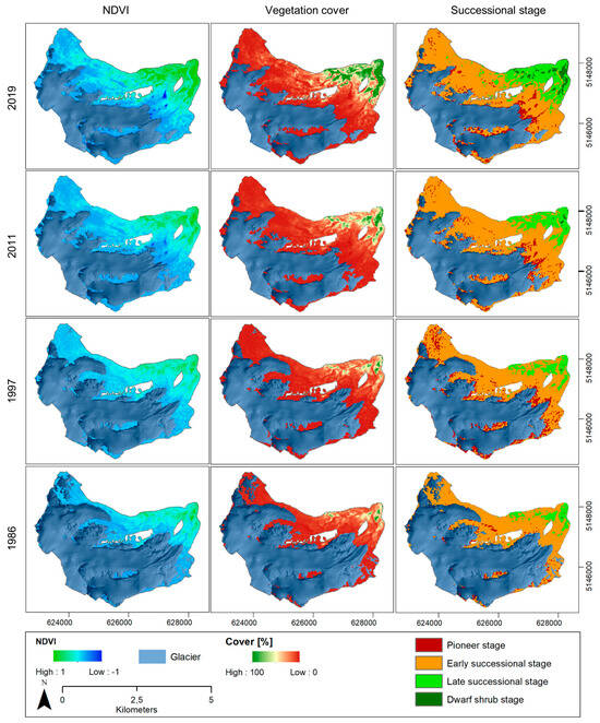 Vegetation modelling in the glacier forelands: 2019–2011–1997–1986. Results are based on in-situ investigations and the NDVI and are presented area-wide as vegetation cover (%) and classified successional stages.