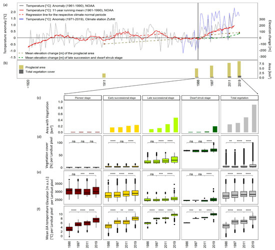 Temporal development of glacier forelands and primary succession under the aspect of global warming. The temperature development (a) is shown as long-term temperature anomaly (1961–1990; annually; 11-year running mean; regression line for each climate normal period) based on the NOAA time series (1836–2015) and as annual temperature anomaly (1973–1990) for the Zufritt weather station (1973–2019; upper Martell Valley, 46.51°N, 10.73°E; 1851 m a.s.l.) (left y-axis). Based on the determined temperature lapse rate (−0.0048 K/m), the respective elevation change [m] is shown for the temperature (right y-axis). Further, the mean elevation change of the proglacial area and the vegetation cover (late successional and dwarf shrub stage) are visualized. The development of the (b) proglacial area (km2) and the total vegetation cover (km2) are shown as bar diagrams. Primary succession is shown as (c) bar diagram, indicating the area (km2). Statistical relations between the observed years are visualized as boxplots for the (d) mean vegetation cover (%), (e) mean elevation (m a.s.l.) and (f) mean JJA temperature (°C) of the respective vegetation successional stage according to the Landsat pixel (30 m × 30 m). The statistical analyses are shown for each successional stages and the total vegetation cover (grey). The statistical relations are indicated as asterisks (n.s. = not significant, * p < 0.05, ** p < 0.01, *** p < 0.001, **** p < 0.0001).