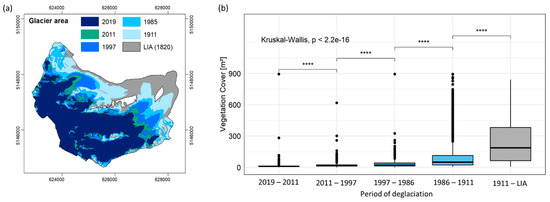 Relationship between glacier retreat and vegetation cover. The (a) area-wide glacier development led to a constant enlargement of the proglacial area. The (b) statistical relation between the vegetation cover per Landsat pixel [m2] of the year 2019 were tested in dependency of the development of proglacial area (**** p < 0.0001). The pixels were categorized according to the interval of deglaciation. Source of glacier data: ~1820/End of LIA: Own mapping of the lateral moraines in the field and from the ALS-Hillshade (2019), 1911: Map of the 4th Federal survey, 1985: DGM and Orthophoto (Autonomous Province of Bozen/Bolzano, South Tyrol), 1997: Glacier Inventory South Tyrol; Hydrological Office (Autonomous Province of Bozen/Bolzano, South Tyrol), 2011 and 2019: Own mapping based on ALS-data (see Section 2.2.3).
