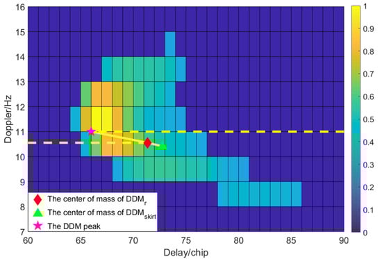 - Calculate the coordinates of the DDM peak point (, ) and the centroid coordinates ( ) of , where X represents the time delay, Y represents the Doppler shift and T(X, Y) represents the corresponding power at the time delay X and the Doppler shift Y. The calculations of X and Y are shown in Equations (1)–(3).