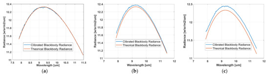 Radiometric calibration error at various sensor internal temperature differences (TDs): (a) TD = 0.1 K; (b) TD = 0.9 K; (c) TD = 2.2 K.