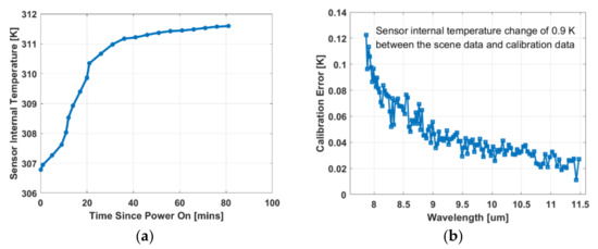 Figure 3 shows that the calibration error increased as the TD value increased. Generally speaking, a temperature inversion accuracy of 1 K requires the calibration error to be controlled within 0.5 K. Therefore, the TD should be kept within a small range. Figure 4a shows the temperature change trend of the Hyper-Cam LW instrument. This shows that the sensor’s internal temperature sharply increased as the power-on time became longer and gradually stabilized after approximately 40 min. Figure 4b shows that when the TD value was 0.9 K, the calibration error of each band was within 0.5 K. In addition, since the field environment was relatively unstable compared to the indoor environment, the instrument may have taken a longer time to reach a stable state. This depended on the specific measurement conditions.