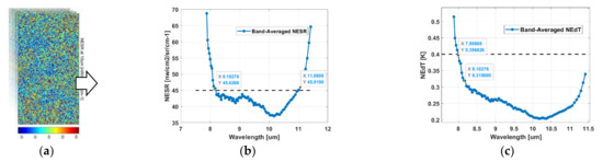 The NESR is related to the spectral resolution and the integral time for the Hyper-Cam LW sensor with a specific optical system, according to Equation (2). In the noise level estimation, the NESR was calculated as the pixel-wise standard deviation of the radiance over multiple successive data cubes from the same target. The band-averaged noise-equivalent delta temperature (NEDT) was also calculated for every band based on the NESR. The statistical noise distribution of the NESR and NEDT is shown in Figure 5.