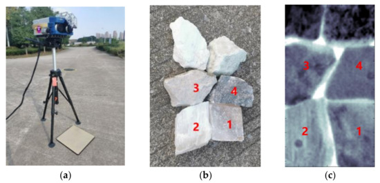 The mineral samples used in this study were calcite (No. 1), fibrous gypsum (No. 2), dolomite (No. 3), and anhydrite (No. 4). The size of all the samples was around 6 × 9 . All these materials have distinct emissivity signatures, which facilitated the evaluation of the processing results. Attention must be paid to avoiding rapid temperature changes of samples, so they were exposed to the experimental scene for some time in order to reach thermal equilibrium between the samples and the field environment.
