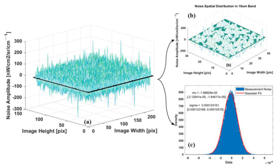 TIR hyperspectral imagery noise analysis: (a) the pixel-wise noise in the 10 µm band; (b) the noise for a small random window; (c) the magnitude distribution of all the pixels in the 10 µm band.