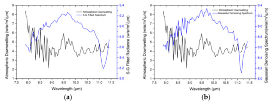 Comparison between spectral and spatial denoising for Hyper-Cam LW hyperspectral imagery: (a) comparison between S–G-filtered image radiance and atmospheric downwelling; (b) comparison between Gaussian spatial denoising result and atmospheric downwelling.