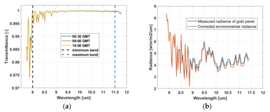 (a) Simulated atmospheric transmittance by MODTRAN®5.2; (b) comparison between the corrected environmental radiance and the measured radiance of the gold-coated panel.