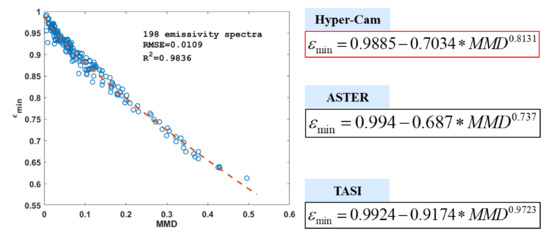 The empirical relationship between the minimum emissivity value and the MMD is the key feature of the method, and it needs to be established for specific sensor data. In this study, to obtain a reliable empirical relationship, 198 spectra extracted from the JHU spectral library (including water, vegetation, soil, and rock spectra, which were converted to emissivity using Kirchhoff’s Law and resampled according to the spectral information of the Hyper-Cam LW data) were used to fit the relationship. The fitting results of the empirical relationship for the Hyper-Cam LW sensor are shown in Figure 11. It is clear that the parameters of the empirical relationship between the minimum emissivity value and the MMD for Hyper-Cam LW data were distinctly different from those for other TIR sensors, such as ASTER and TASI.