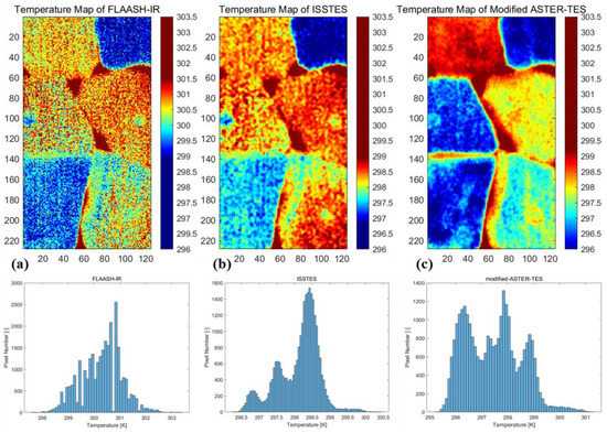 Retrieved temperature maps and corresponding temperature histograms: (a) FLAASH-IR, (b) ISSTES, and (c) modified ASTER-TES.