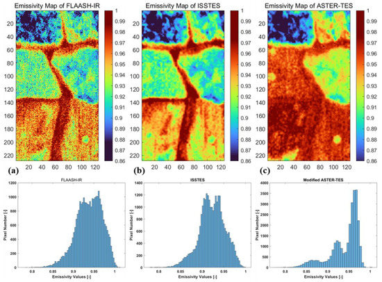 Retrieved emissivity maps in the 10 µm band: (a) result of FLAASH-IR; (b) result of ISSTES; (c) result of the modified ASTER-TES method.