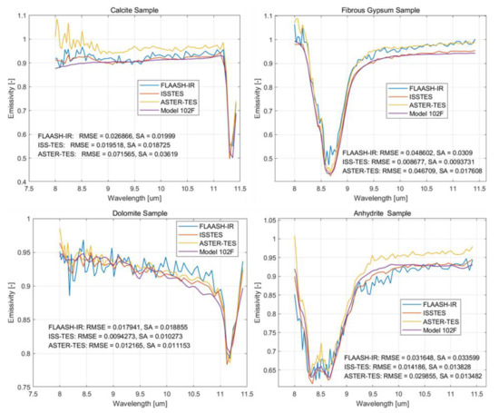 Four different mineral samples were chosen to validate the quality of the retrieved emissivity spectra, i.e., calcite, fibrous gypsum, dolomite, and anhydrite. Firstly, the retrieved emissivity spectra obtained with FLAASH-IR, ISSTES, and the modified ASTER-TES method were compared to the standard spectra. These standard spectra were measured using the widely used D&P Model 102F spectrometer, which is a non-imaging FT-TIR spectrometer. The three indicators were then calculated to quantitatively illustrate the inversion precision. The comparison is shown in Figure 14, with the RMSE and SA values listed in the corresponding figures.