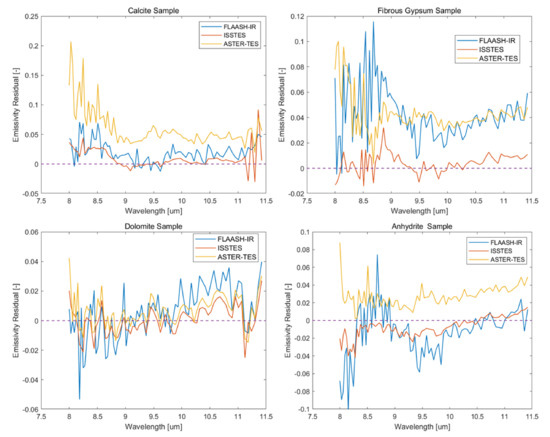 For FLAASH-IR, a distinct characteristic of the emissivity spectra is that they are relatively irregular compared to those from the other two processing methods. The FLAASH-IR emissivity values of some bands below 8.5 μm are greater than 1.0. This may be caused by measurement noise. For a true emissivity value close to 1.0, the retrieval emissivity result may be greater than 1.0. In addition, due to the empirical relationship in ASTER-TES, the relationship may also result in emissivity values greater than 1.0. For ISSTES, since the method is based on physical retrieval and the noise is eliminated via spatial convolution denoising, the result of emissivity value was less than 1. It should be noted that, compared to the spectral range with relatively high emissivity values, FLAASH-IR and ASTER-TES have coarser features in the spectral range with low emissivity values. This phenomenon is clearly shown in the anhydrite sample spectra shown in Figure 12, which suggests that these two methods may have retained the atmospheric residuals. Furthermore, an interesting phenomenon is that the magnitude of the calcite and fibrous gypsum emissivity spectra from FLAASH-IR was greater than that of the standard spectra, while the magnitude of the dolomite and anhydrite emissivity spectra was smaller than that of the standard spectra. One explanation for this phenomenon is that the radiance of the surrounding objects contained in the background was not considered in FLAASH-IR, leading to incorrect environmental radiance estimation.