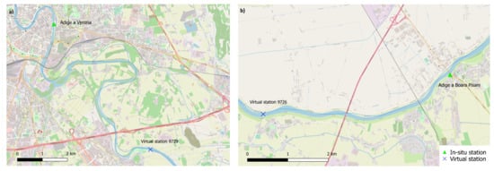 Table 1 provides information about each of the gauging stations selected, including the river, the region it belongs to, the geographical coordinates, the width of the river section, the satellite sensor providing data, and the distance with the correspondent virtual station. In particular, we have 4 stations on the Po river, 5 stations on the Tevere river, 3 stations on the Adige river, and 1 on the Adda river. These are the four longest rivers in Italy, each more than 300 km in length. Tevere river has a North–South orientation and passes through four different regions: there is a section at Ponte Nuovo in Umbria (in the North–South direction of the river channel) and four stations on the outlet of the river in the Lazio region (in the West–East orientation of the river channel). Arno river horizontally crosses the Tuscany and has a total length of 241 km. The four selected stations in the Arno river are located on the last part of the river path. Ombrone has a total length of 161 km and Livenza of 112 km. The two stations along these rivers are both on the outlet part. The altitude of the in situ stations is in the range of [0, 186] m a.s.l., so we do not have mountain stations. The data of the gauging stations were acquired with the minimum time scale available (up to 10 min) provided by the regions they belong to.