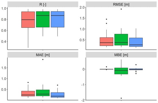 Boxplots of the performances in terms of R, RMSE, MAE and MBE comparing in situ and satellite water level differences (in pink), water levels where the satellite water levels are obtained by imposing the initial water level (green), and water levels where the satellite water levels are obtained by calibrating the initial water level (in blue).