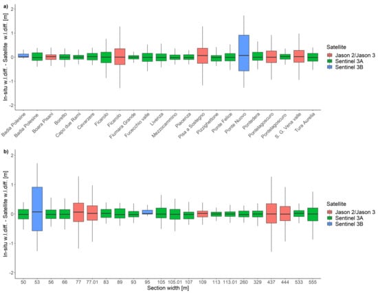 (a) Boxplots of the differences (in situ water differences minus satellite water differences) for each of the 22 pairs, with different colors distinguishing the different satellites. (b) Boxplots sorted by river section width.