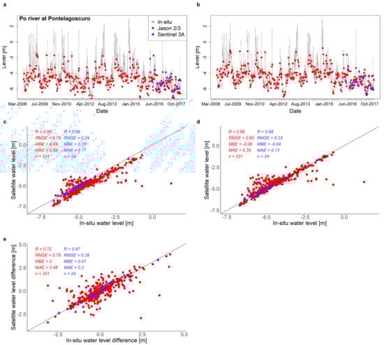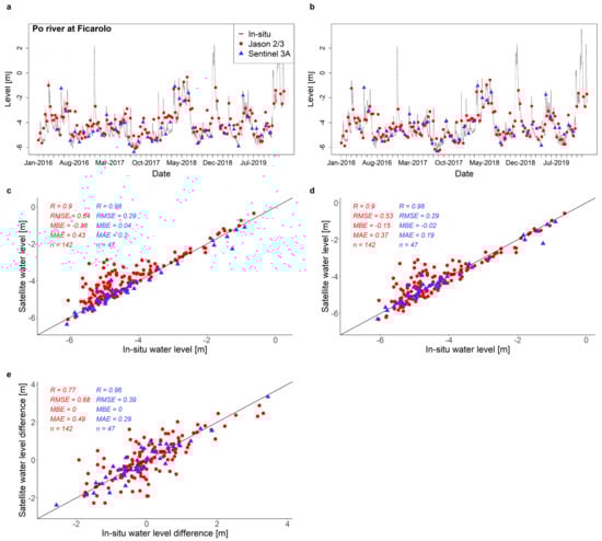 Po river at Ficarolo (Veneto): (a) temporal variability of satellite and in situ water level, where the satellite water levels are obtained by imposing the initial water level; (b) as in panel (a) but the initial water level was calibrated; (c) scatterplot satellite-in situ water levels given in panel (a); (d) scatterplot satellite-in situ water levels given in panel (b); (e) scatterplot satellite-in situ water level differences.