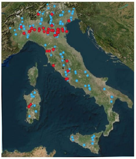 Map of the virtual stations (existing ones indicated with red circles and potential new ones indicated with blue circles) in Italy, for which the altimeter on board DEM (OLTC) is tuned to track the water [59] (V6 DEM was uploaded onboard Sentinel 3A at the end of August 2020 [57]). The quality check of time series of new targets is currently in process. If the new targets satisfy the quality requirements, they could be added to the existing virtual stations, permitting a coverage also of southern Italy and islands, in the next future.