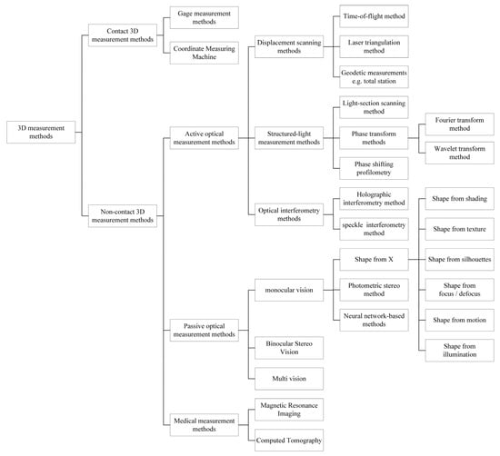 According to the implementation steps, the 3D reconstruction technology can be divided into two main parts: digital point cloud acquisition and point cloud data processing. The classification of 3D information measurement methods, which is considered the most fundamental point cloud acquisition method, is given in Figure 1.
