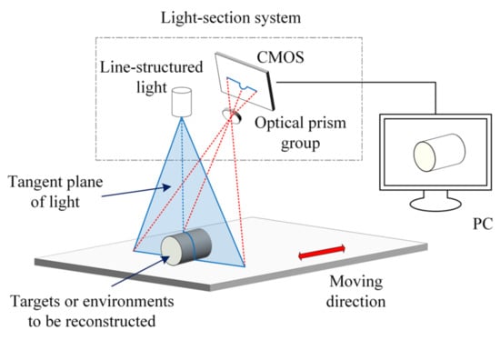 This article mainly focuses on the 3D light-section reconstruction technology based on single line-structured light, the schematic diagram of which is shown in Figure 3. First of all, the feature coordinates in a specific plane in the three-dimensional space are obtained by the principle of laser triangulation measurement in the case of a single frame; Multiple frames of data can be registered under the same coordinate system to obtain the original point cloud data of the object to be reconstructed with the aid of the mobile device and system calibration results. Afterwards, filtering is performed to weaken the influence of noise in the measurement environment to obtain the topological relationship in the point cloud after down-sampling and reduction. Finally, the high-precision three-dimensional reconstruction of the object is achieved through shape representation and other processing methods.