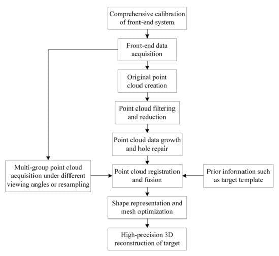 This review takes the technological path and corresponding principles as the logical sequence, which is shown in Figure 3, to give a detailed summary of the latest development status of each key technology, hoping to provide help for the following research ideas. The rest of the paper is organized as follows: Section 2 discusses the methodology used. Section 3 introduces the acquisition of original point cloud data, which contains the triangulation measurement principle, point cloud filtering and decorating methods. In Section 4, point cloud reduction methods are presented through five subdivision types. Section 5 summarizes five types of point cloud registration methods based on different principles. Meanwhile, three categories of 3D shape representation methods are discussed in Section 6. The summary and conclusion of the paper, along with future directions of this field, are given in Section 7.