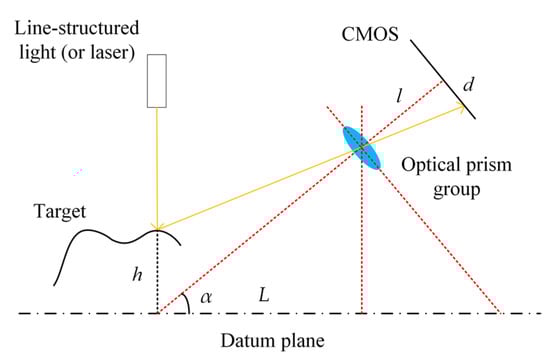The original point is the intersection of the laser and the lens normal when the laser is incident perpendicular to the reference plane. The plane that passes through this point, which is also perpendicular to the laser line, is taken as the reference plane. The height h of the measured point of the object can be expressed as: