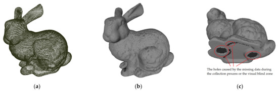 The classical Stanford Bunny: (a) original digital point cloud containing only spatial coordinate information; (b) point cloud containing a variety of 3D information after 3D reconstruction; (c) the holes caused by the missing data during the collection process or the visual blind zone.