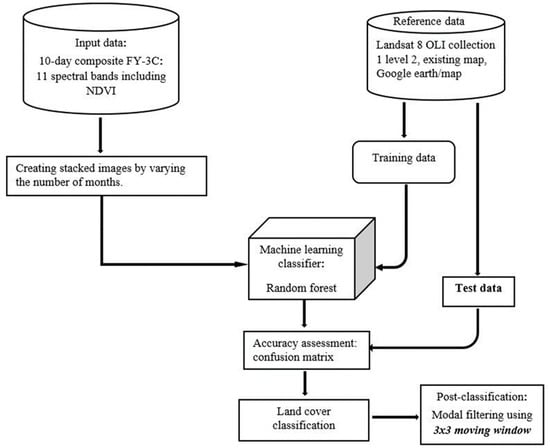 Stepwise experimentations were carried out by increasing the number of months, i.e., temporal data. We started with a one-month stacked image comprised of three 10-day composite scenes where each scene has 11-band including the average maximum NDVI and 1 km spatial resolution; and then increased the number of the month by three, six, nine, and twelve. The months were set to be consecutive beginning from April 2019 to March 2020 and divided considering the four annual seasons. In addition, two different input data sets were generated by the band selection/reduction method from the one-year data that makes the total amount of input data sets seven. For all input data sets, a random forest algorithm was trained using the same training samples (91207 training pixels), but different quantities for each class, that were collected from Landsat imageries. Finally, all the input data were tested against the same independent test samples that consist of 27667-pixel.